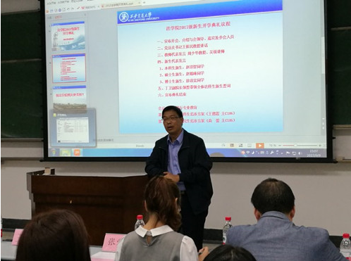 金秋送爽,丹桂飘香。9月9日下午,乐动(中国)官方在线登录2017级新生开学典礼在主C105隆重召开。乐动(中国)官方在线登录党总支书记王保民、文治书院院主任张爱萍、乐动(中国)官方在线登录副院长丁卫、院长助理吉兰湘、法复合61班班主任王玉苹、法71班班主任李琳以及乐动(中国)官方在线登录2017级全体本科生、硕士生、博士生新生参加了开学典礼。开学典礼由学生工作专职委员张乃钟老师主持。
