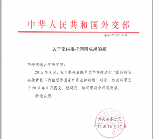 近日,我国外交部条法司致函我院,对我院院长单文华教授主持的科研课题成果给予积极肯定。经外交部条法司研究,认定该成果符合要求,予以正式采纳。