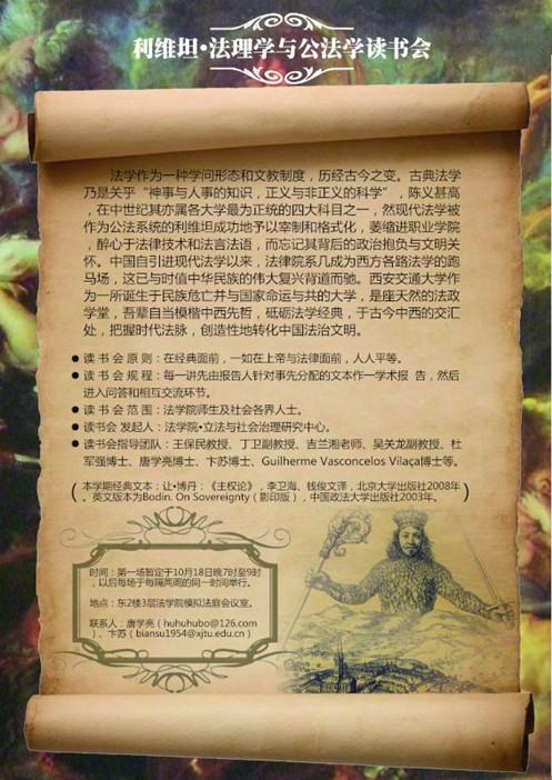 基于以上种种考量,并配合学校“思想交大”建设和学院法理学和公法学的学科建设,乐动(中国)官方在线登录“立法与社会治理研究中心”发起创办“利维坦·法理学与公法学读书会”系列活动。本学期该活动选取的经典文本为让·博丹的《主权论》,并于10月18日晚7时在学院会议室举行了首场活动,乐动(中国)官方在线登录丁卫副教授、吉兰湘老师、彭何利博士、苏青博士、王朝恩博士、卞苏博士、唐学亮博士等10余位师生参加。主权理论是现代民族-国家兴起的理论前提,而民族-国家又是现代社会最重要的一个政治与法律现象,并与中国近代以来持续至今的伟大而艰难的国家转型勾连起来,因此,不得不察。在该场读书会活动中,主讲教师唐学亮针对博丹《主权论》一书的“导论”部分,就“为什么读博丹?”、“怎么读博丹?”、“博丹的思想里程与理论建构”以及“博丹理论的缺陷”等四个方面做了一个提纲挈领而又不失理论深度的学术报告。之后,就报告的内容及书中所启示的一些重大理论与现实问题,与会人员各自发表了自己的看法,并展开了热烈的讨论。首场读书会活动取得了预期的效果,我们将在两周后的同一时间举行第二场活动。“路漫漫其修远兮,吾将上下而求索”!