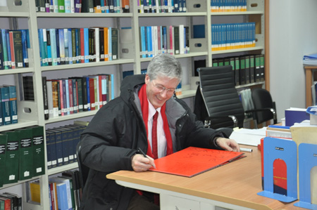 报告后,Rolf Fife司长来到乐动(中国)官方在线登录。乐动(中国)官方在线登录院长单文华教授会见了Rolf Fife司长,并带领他参观了学院文化大厅和丝绸之路国际法与比较法研究所。Rolf Fife司长对研究所的研究条件赞不绝口。他在嘉宾册上写下感想,希望研究所成为国际交流的桥梁,并祝愿中挪友谊健康发展。随后,他和研究人员合影留念。