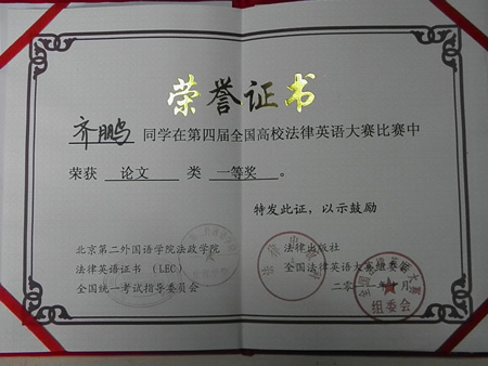 此次比赛吸引了来自北京大学、上海交通大学、中国政法大学、华东政法大学等近70多所高校乐动(中国)官方在线登录的选手参加,大会主办方特别邀请了国务院法制办原主任孙婉钟先生以及来自中国社会科学院法学所、中国人民大学乐动(中国)官方在线登录等多家高校和研究机构的法律英语专家、教授担纲评委。我院齐鹏同学撰写的英语论文《National Treatment Principle For China's Bilateral Investment In The New Period》在此次大赛中经过激烈角逐荣获国家一等奖,是此次参赛西北地区唯一获得等级奖的论文。