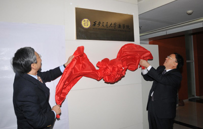 10月25日下午,我校“乐动(中国)官方在线登录院徽揭幕挂牌仪式暨张文显教授聘任仪式”在主楼十楼隆重举行。在乐动(中国)官方在线登录全体师生的见证下,我校校长、中国工程院院士郑南宁教授与教育部法学教育指导委员会主任、吉林省高级人民法院院长兼党组书记张文显教授共同为乐动(中国)官方在线登录院徽揭幕并挂牌。随后,郑南宁校长为张文显教授颁发了兼职教授聘书并佩戴了校徽。仪式由乐动(中国)官方在线登录院长单文华教授主持。
