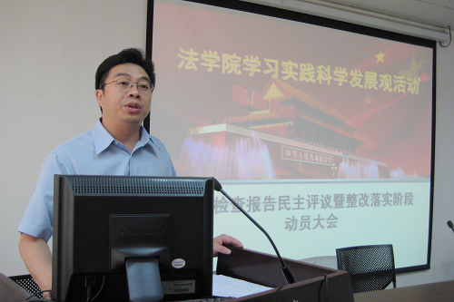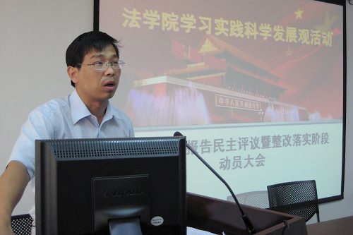 乐动(中国)官方在线登录总支书记、院长、学习实践活动领导小组组长单文华,首先向与会师生做了《乐动(中国)官方在线登录领导班子贯彻落实科学发展观情况分析检查报告》。他说,遵照校党委关于深入开展学习实践科学发展观的工作部署,乐动(中国)官方在线登录围绕“育法学栋梁,谋创新发展,创一流学院”的学习实践载体,认真学习理论、深入调查研究、开展解放思想大讨论、广泛征求意见建议,在此基础上召开专题民主生活会。会议举行之前,院领导班子成员之间开展了充分深入的谈心交流活动,并就会议准备事项在院党总支会议上进行了专题研究。在此基础上,经过院党总支会议研究讨论,最终形成了乐动(中国)官方在线登录领导班子分析检查报告。分析检查报告包括学习实践科学发展观活动的中学院领导班子形成的共识、乐动(中国)官方在线登录建院一年多以来取得的主要成效、乐动(中国)官方在线登录在贯彻落实科学发展观中存在的突出问题、原因以及今后贯彻落实科学发展观的主要思路和对策等四个方面。他最后强调,乐动(中国)官方在线登录党总支要以深入开展学习实践科学发展观活动为契机,围绕打造“育法学栋梁,谋创新发展,创一流学院”的目标,着力完善师资队伍建设、学科建设、专业设置、学生管理等方面机制;强化服务意识,加强领导班子作风建设,创新发展理念,破解发展难题,提高发展水平,应对新挑战、抢抓新机遇,在服务大局中实现乐动(中国)官方在线登录的科学发展。