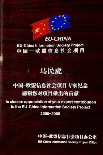 2009年7月,中国—欧盟信息社会项目(EU-China Information Society Project)为马民虎教授颁发了纪念与贡献奖章,以感谢马民虎教授对该项目所做出的杰出贡献。