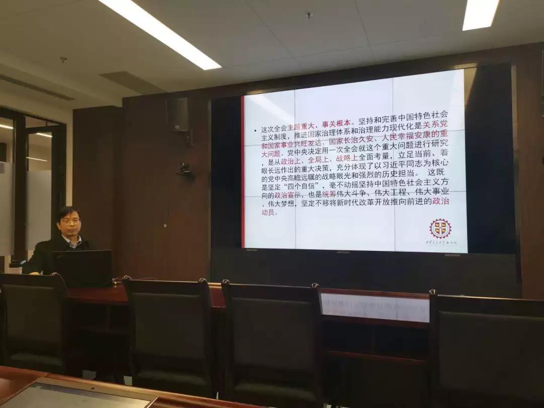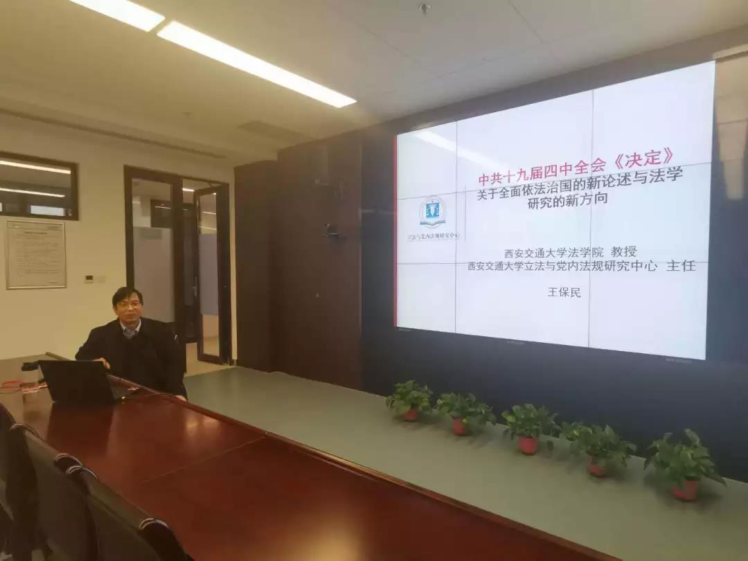 12月12日,乐动(中国)官方在线登录创新港系列学术讲座之“十九届四中全会关于全面依法治国的新论述与法学研究新方向”在创新港5号巨构10087教室顺利举行。乐动网页版乐动(中国)官方在线登录党总支书记、乐动网页版立法与党内法规研究中心主任王保民教授围绕中共十九届四中全会召开的基本情况和重要意义、《决定》中的高频词汇和理论亮点、《决定》关于全面依法治国的新论述、法学研究的新方向新热点等五个方面做了专题讲座。
