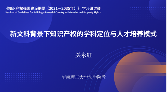 关永红教授首先提出了新文科建设包括实现价值重塑性、实现理论规则创新性、实现学科交叉和科际整合以及实现研究方法的创新四个方面的核心目标。随后,他借助《国家知识产权战略纲要》、《十四五国家知识产权保护和运用规划》等文件对知识产权学科定位的政策支撑和目标进行了深刻解读,并对研究型和应用型知识产权人才培养模式的创新和重点进行了分析。最后,他提出可以在已有的核心课程中考虑纳入交叉课程和新技术法学课程,编纂符合时代性、应用性、可读性和高质量的知识产权专业教材,完善新文科背景下知识产权人才培养模式。