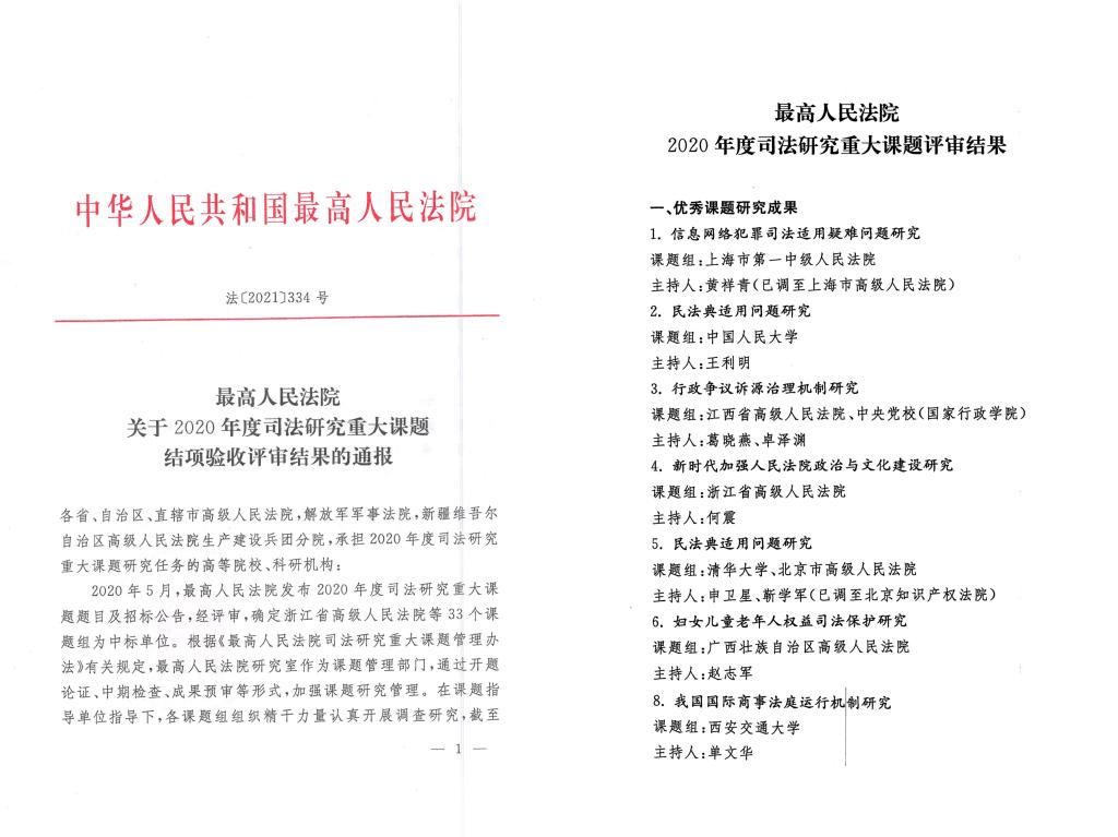2020年5月,最高人民法院发布了2020年度司法研究重大课题题目及招标公告,经评审,确定乐动网页版单文华教授课题组等33个课题组为中标单位。这也是我校获批的第一个最高人民法院重大课题。