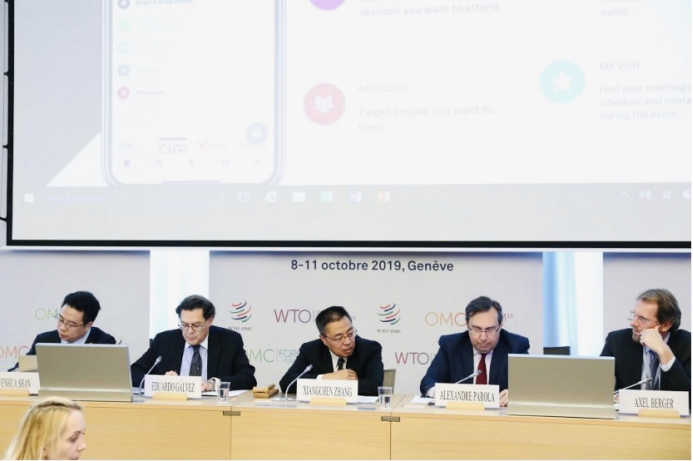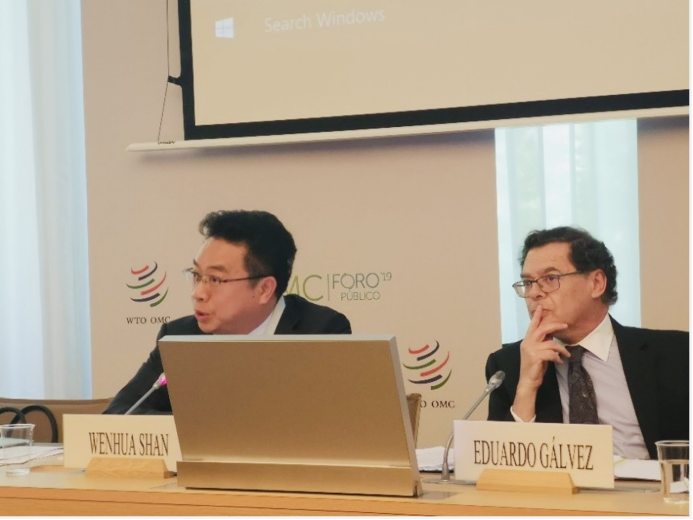 同年十月,世界贸易组织(WTO)2019年度公共论坛在瑞士日内瓦WTO总部成功举办。WTO总干事罗伯托·阿泽维多(Roberto Azevêdo)在开幕式上致辞。来自100多个国家和地区的3000多名政府、学术、工商、社团等各界代表出席论坛。应我国驻WTO使团邀请,单文华教授出席本次论坛,并在“面向发展的投资便利化”专题研讨会上做主讲发言。