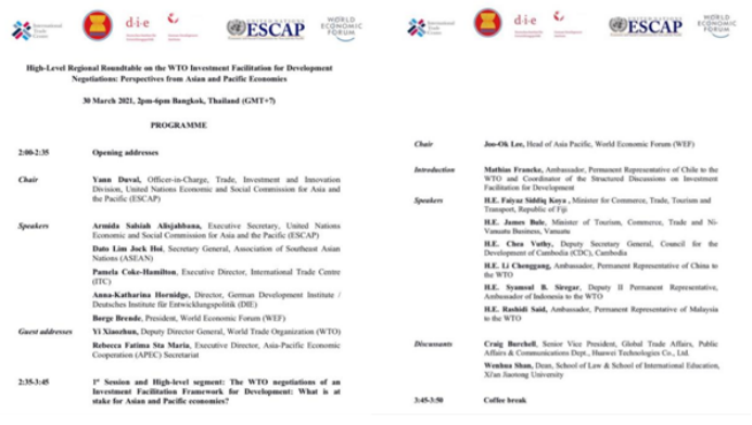 2021年3月, WTO投资便利化促进发展谈判区域高层圆桌会议:亚太经济体的视角(High-Level Regional Roundtable on the WTO Investment Facilitation for Development Negotiations: Perspectives from Asian and Pacific Economies)在泰国曼谷举行,单文华教授作题为“WTO投资便利化谈判所面临的挑战”的在线大会发言。