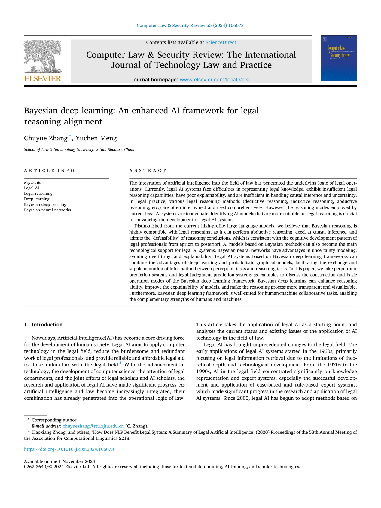 近日,乐动网页版人工智能与信息安全法律研究中心刘东亮教授指导的博士研究生张楚悦、孟宇辰在SSCI一区期刊《计算机法律与安全评论》(Computer Law & Security Review , Volume 55, November 2024)上发表论文《贝叶斯深度学习:与法律推理相协调的增强型人工智能框架》(Bayesian Deep Learning: An Enhanced AI Framework for Legal Reasoning Alignment)。