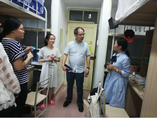 随后,丁院长和王老师一起走访了学生宿舍,丁院长仔细查看了同学们的住宿环境,每走进一间宿舍,都向同学们致以亲切的问候,继而关切地询问他们的具体情况,来自什么地方、入学手续办理的情况等。同时,细心地询问同学们是否适应新的环境,嘱托大家不论学习还是生活中遇到任何问题都要积极与老师沟通,勉励同学们尽快适应、开启美好的大学生活。同学们也纷纷表示十分感谢老师们的看望,切实感受到了学院对大家的关心。