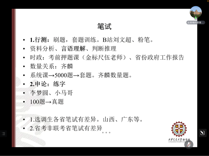 第二位分享的嘉宾是已被国家税务总局西安市莲湖区税务局拟录用的赵昊楠同学,他向同学们分享了选调考试的报名、笔试、面试等各个环节的经验。他建议同学们做好长线努力的心态建设,关注各地省情、注重日常积累和模拟练习,最重要的是通过借鉴他人经验找到适合自己的备考方案。