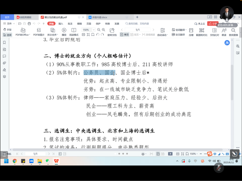 第一位分享的嘉宾是现在中国工商银行总行做博士后的夏伯琛学长。夏伯琛学长的分享从是否选择读博以及博士的就业方向两个方面展开,他详细介绍了博士体制内与体制外的工作方向与求职准备,并建议同学们从自身学术研究的兴趣、能力以及毕业后的规划综合考虑读博的选择,在求职中充分利用已有的信息资源,多投简历,重视面试的准备。